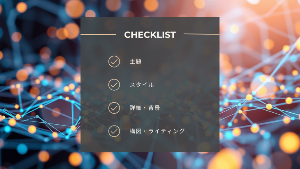 画像生成AIに指示を出す際、以下の4つの要素を順番に盛り込むだけで、クオリティは劇的に安定します。